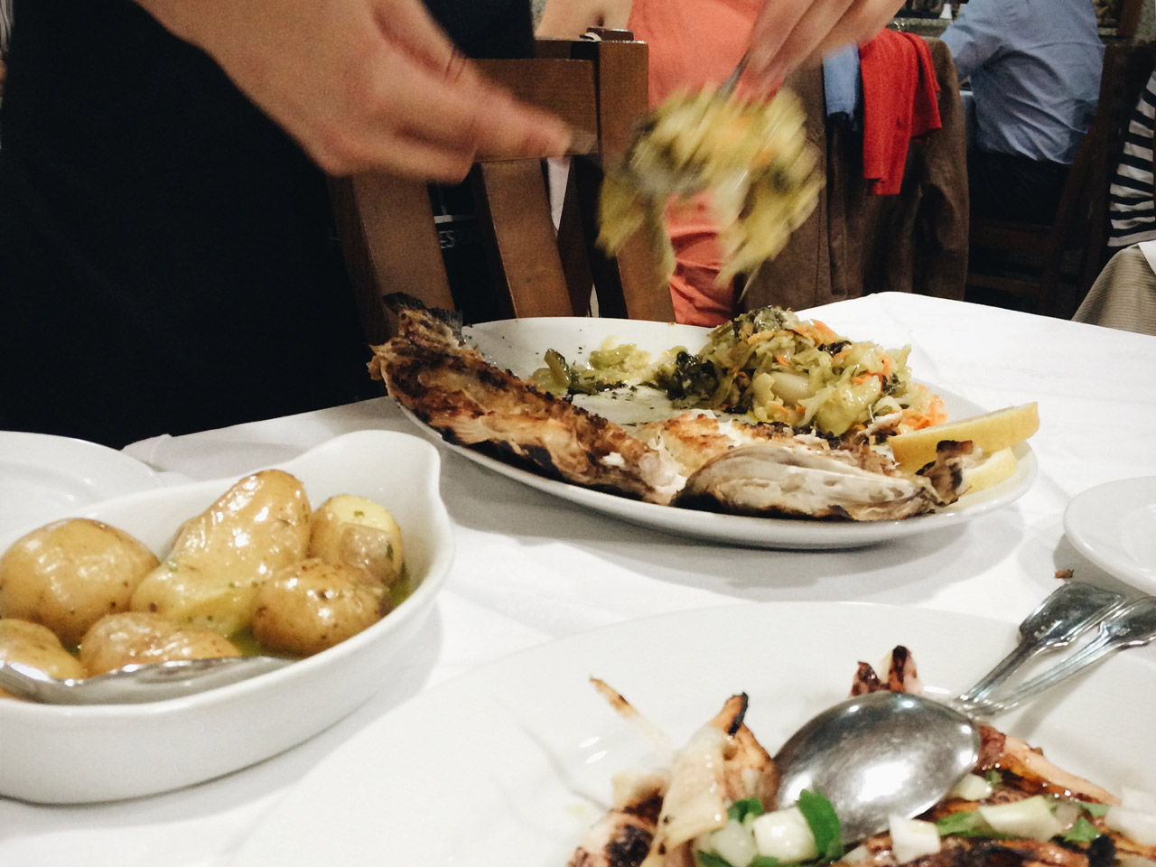 We had an entire sea bream with a huge serving of vegetables and potatoes as well as grilled squid. All that, together with half a bottle of vinho verde*, for less than 40 Euro. In Brussels, it would probably cost almost twice as much for something of comparable quality.