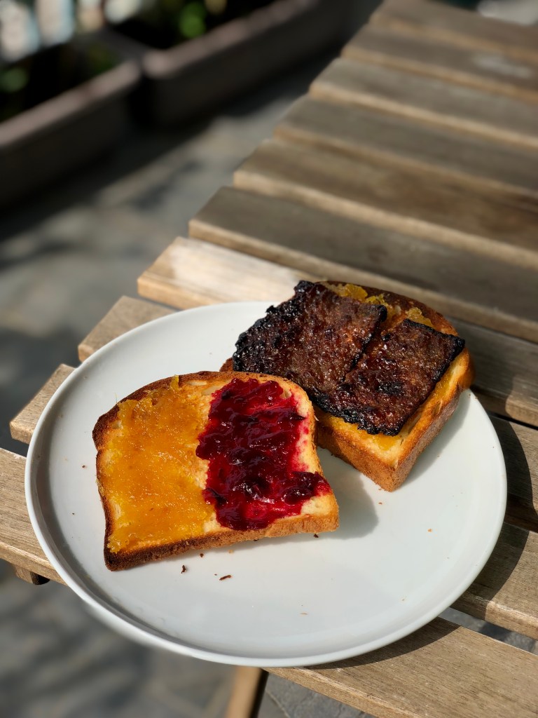 Lightly grilled slices of shokupan with a mellow tang, crisp on the outside yet soft to bite. Completed with a slice of warm savoury-sweet bak kwa sandwiched between them. This is my elevated take on the bak kwa sandwich that I used to enjoy as my first meal of the day during Chinese New Year.