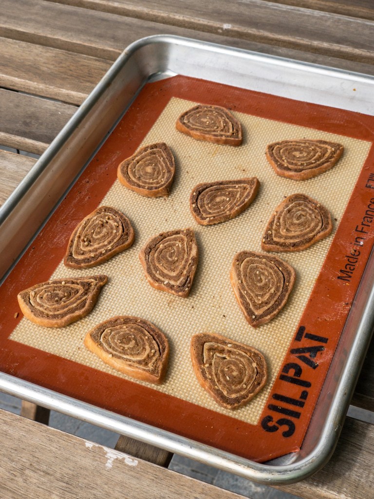 I was satisfied with how my first attempt at making snail biscuits turned out. Other than being mini versions of what I’d normally get at a shop, they looked like what I was aiming for, with the light-and-dark spiral dotted with sesame seeds. At first bite, I was thrown off by the garlicky onion taste. It had been a while since I’ve eaten a cookie with such flavours. It took two servings for my brain to adapt to this sweet-savoury combination, which came close to what I remember of this childhood snack!
