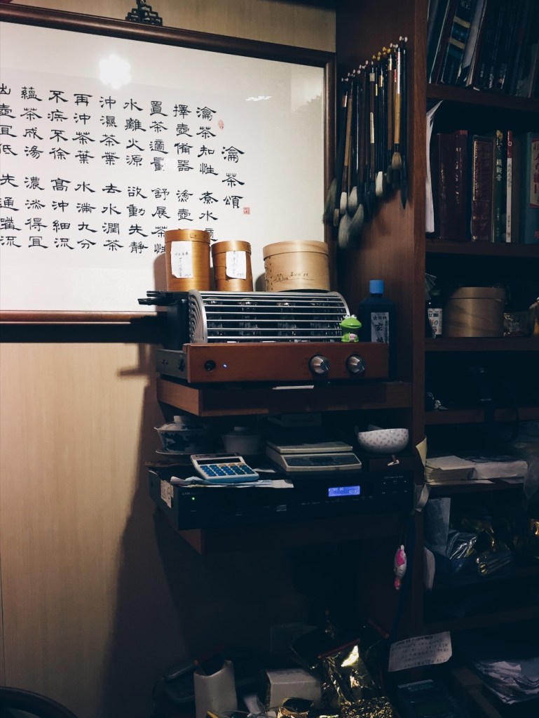 It was Christmas eve the day we decided to go to 茗心坊. We weren’t sure if the shop would be open but fortunately it was when we arrived half an hour before closing time. Mr Lin was chatting with some customers who appeared to be regulars. After they left, he invited us to have a seat at his work bench which was surrounded by tea ware, calligraphy brushes, business cards and books.