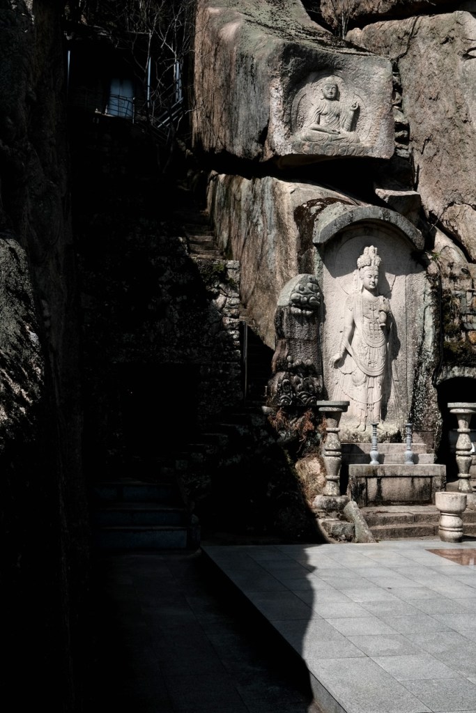 Flanking them are other Buddhas plus arhats in an upper nook accessible via a stone stairway. Seen from this narrow staircase, Busan is framed by these stone walls, as though the buddhas were guarding the city.