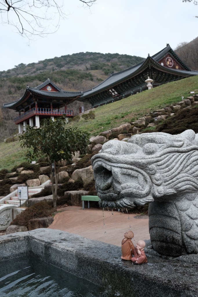 The temple’s name means “Cloud Water Temple” in English. From its lofty perch, one could glimpse the distant sea from the wooden pavilion in front of the historic Daeungjeon Hall. At the bottom of the temple, people were collecting UV-treated water by the jerrycan from the mountain stream. A nearby sign described this as “precious” and “mysterious water.” Not wanting to miss out, I tossed aside my concerns of E. coli and the remaining liquid in my bottle to try some.