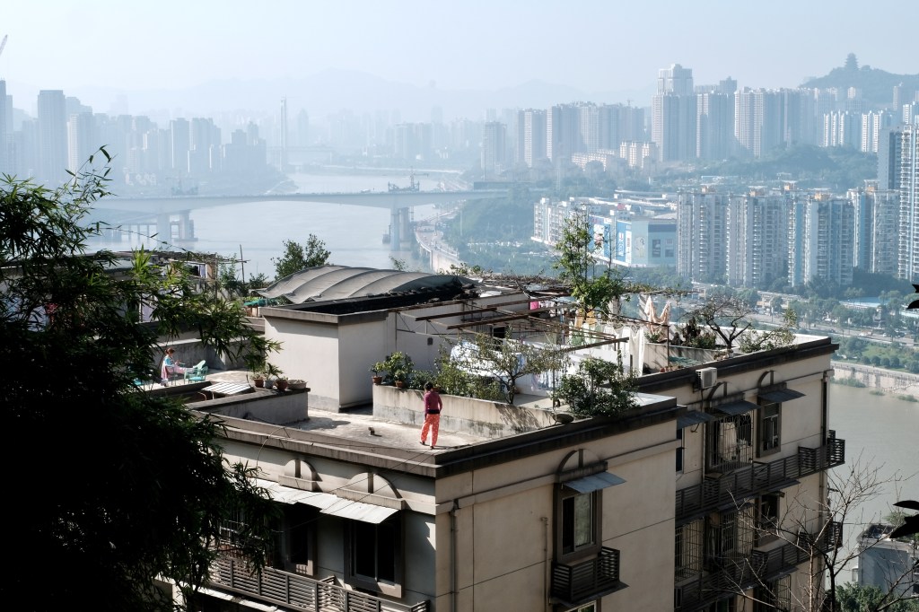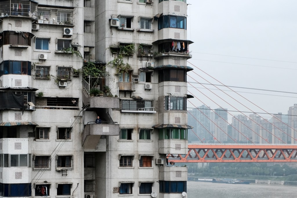 Bai Xiang Ju (白象居) is a residential complex built in 1993 on a slope along the Yangtze. The six blocks rise to the same height, but in fact range from 10 to 26 storeys. There are no elevators in these blocks; lifts were a rarity in those days in China. Residents navigate the complex via elevated bridges linking buildings and strategically positioned entrances. For instance, there is an entrance on the 15th floor from the main road at the top of the slope.