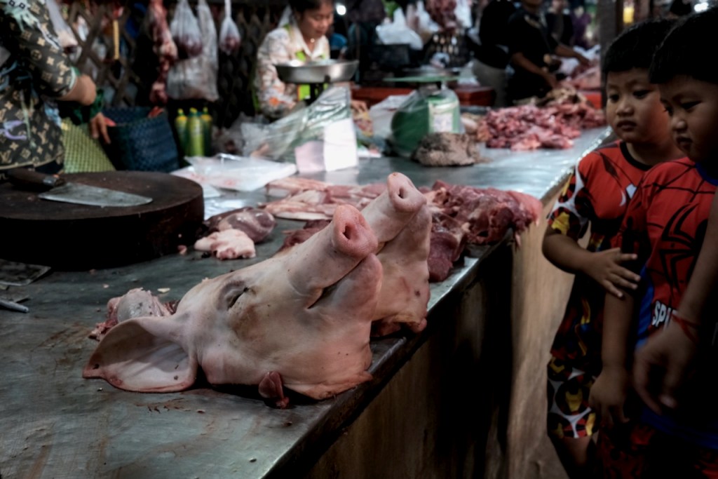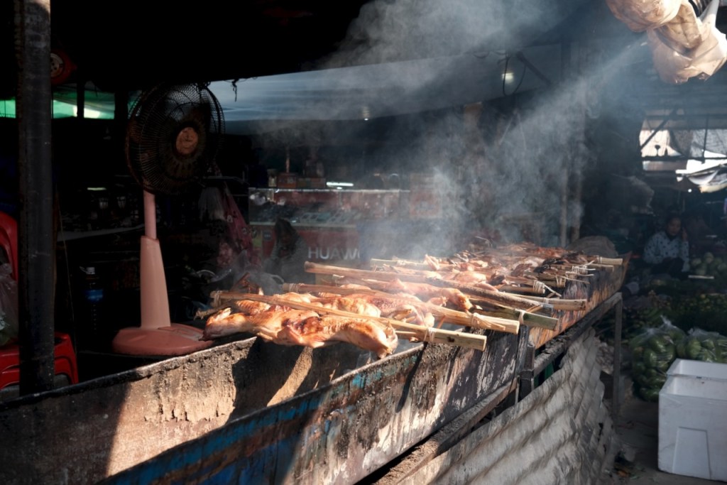 The next day, AB and I visited a local market in Puok, outside the main city centre. We were told that the town is known for grilled chicken, which was the first thing we saw when we arrived. At the entrance was an outdoor food stand with an electric fan blowing clouds of smoke around. There was a row of entire chickens flattened between bamboo halves, with dripping fat sizzling on the hot charcoal.