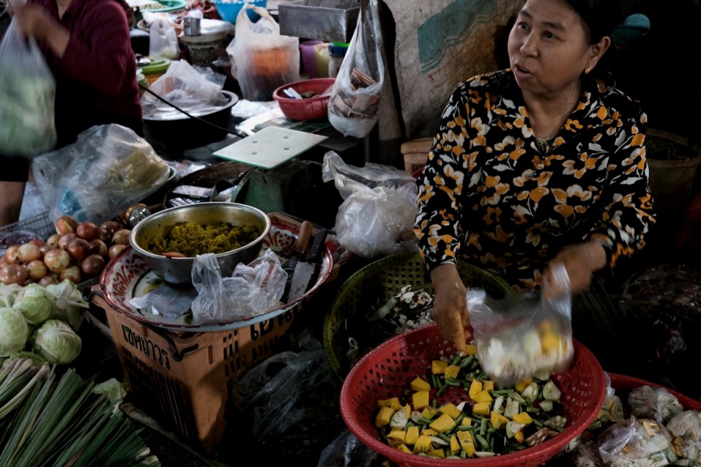 In the dim halls of the market, we passed heaping buckets of pungent prohok made from different fish. I spotted a woman assembling bags of chopped vegetables with a basin of turmeric-coloured paste next to her. Could she be selling prepared bags of Samlor Koko?